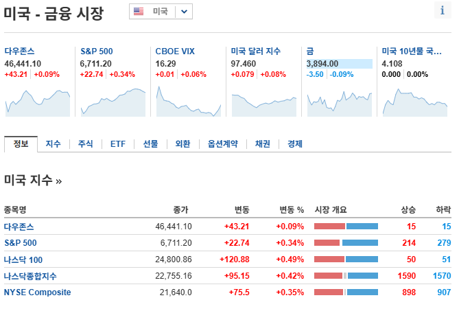 - Dow Jones 산업평균 (다우) : +0.1% 상승 → 46,441.10 (▲43.21포인트)