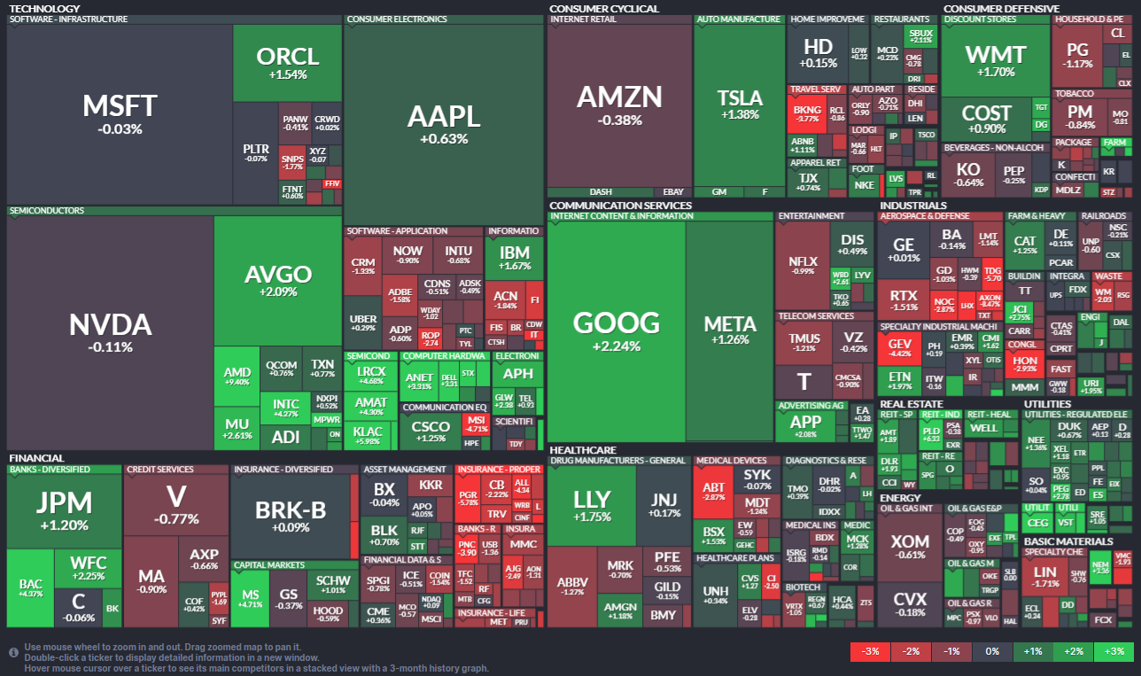 전반적으로 기술주 중심의 강세가 두드러졌고, 은행 업종 실적 호조가 시장 심리를 지탱한 모습입니다.