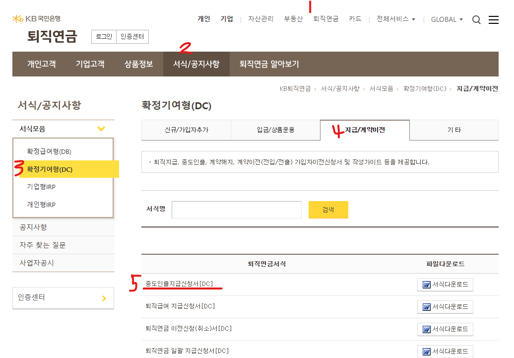 지급/계약이전 ( KB퇴직연금 | 서식/공지사항 | 서식모음 | 확정기여형(DC) | 지급/계약이전 )