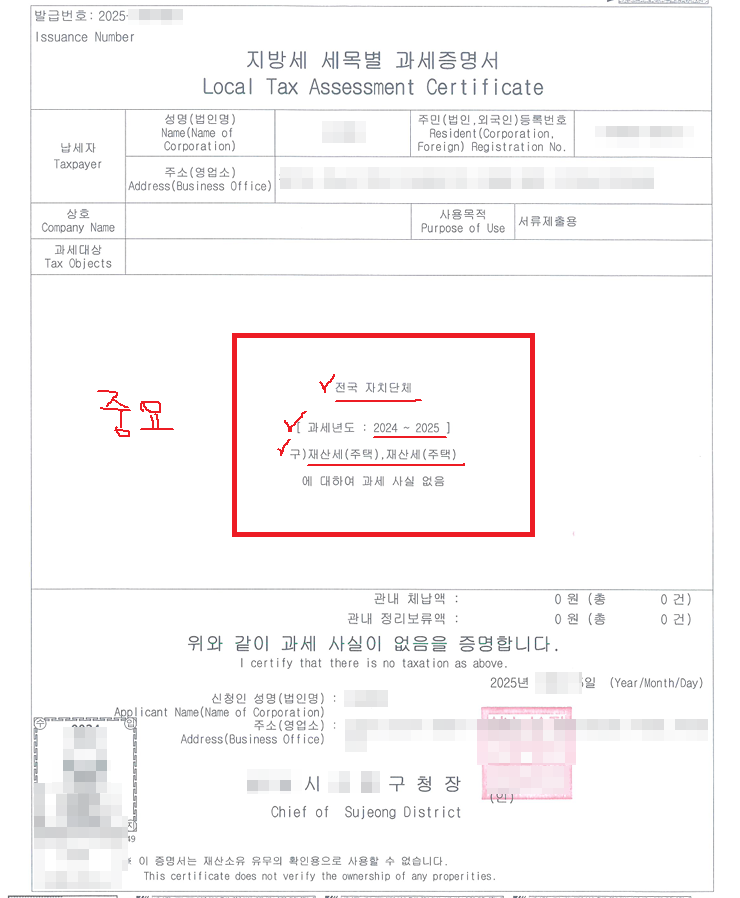 - 발급시 "세목은 재산세(주택)이고, 전국, 24~25년" 으로 발급해달라고하셔야 합니다.