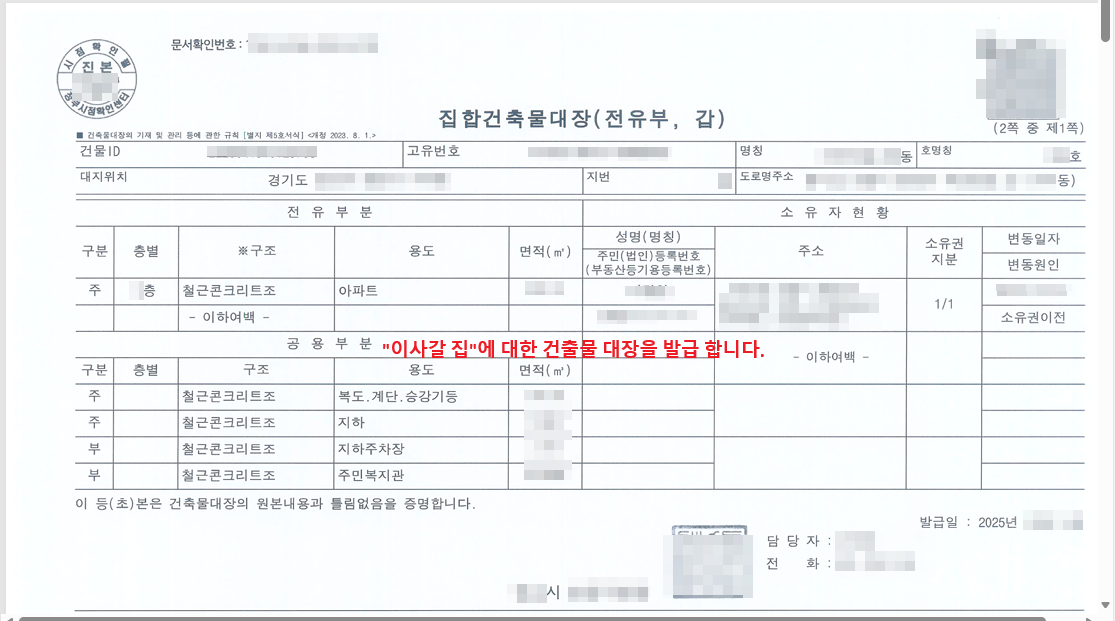 - 정부24 --> 건출물 대장 검색 --> 발급