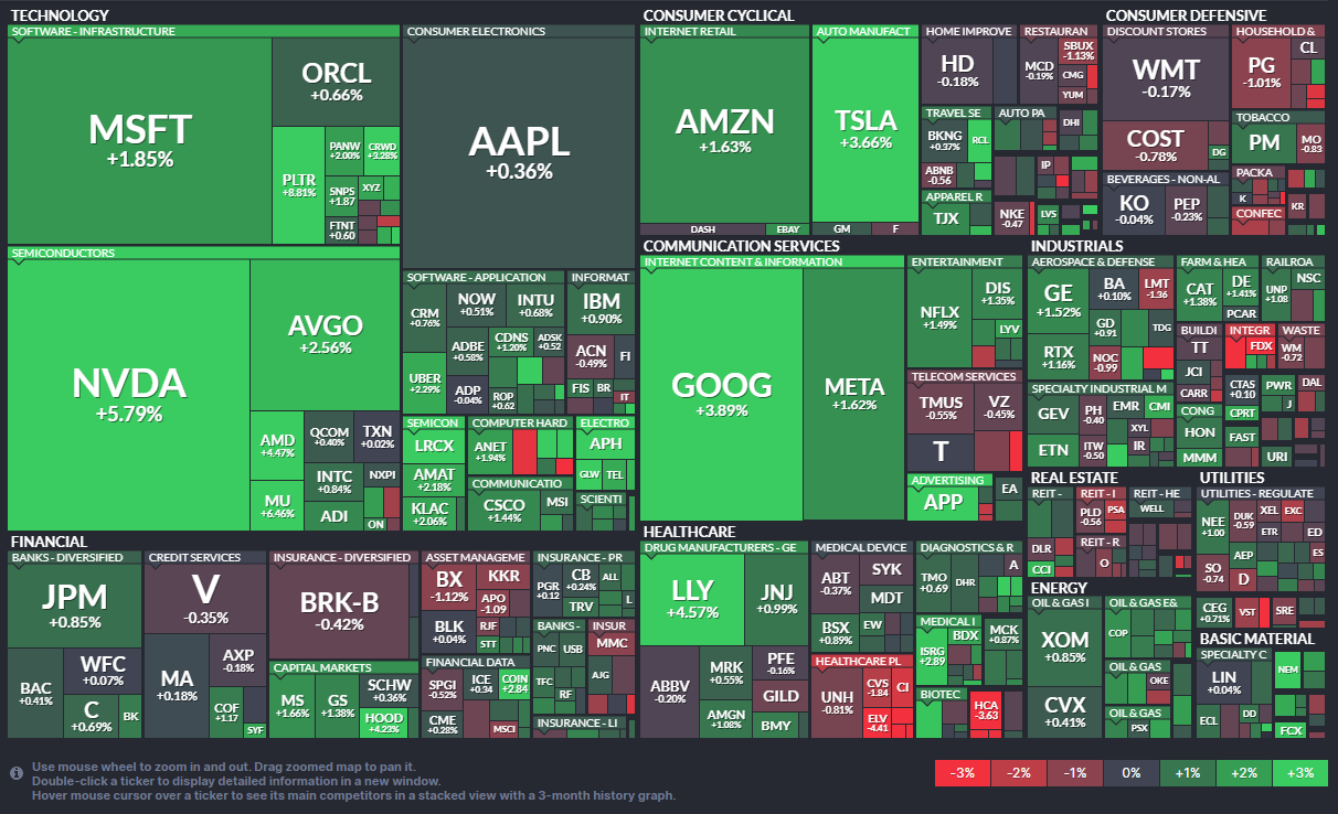 ✅기술·AI주가 주도하며 반등이 나타났는데, Nvidia 등 주요 종목들이 강세를 보였습니다.