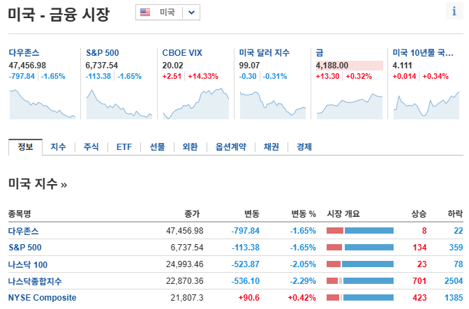 Dow Jones Industrial Average : 47,457.22포인트, 전일 대비 -1.7% 하락.
