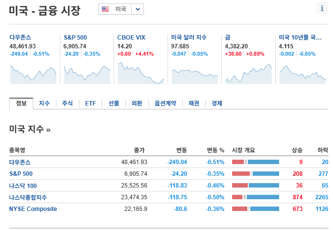 - Dow Jones Industrial Average: 약 -0.5% 하락, 48,461.93포인트 마감.