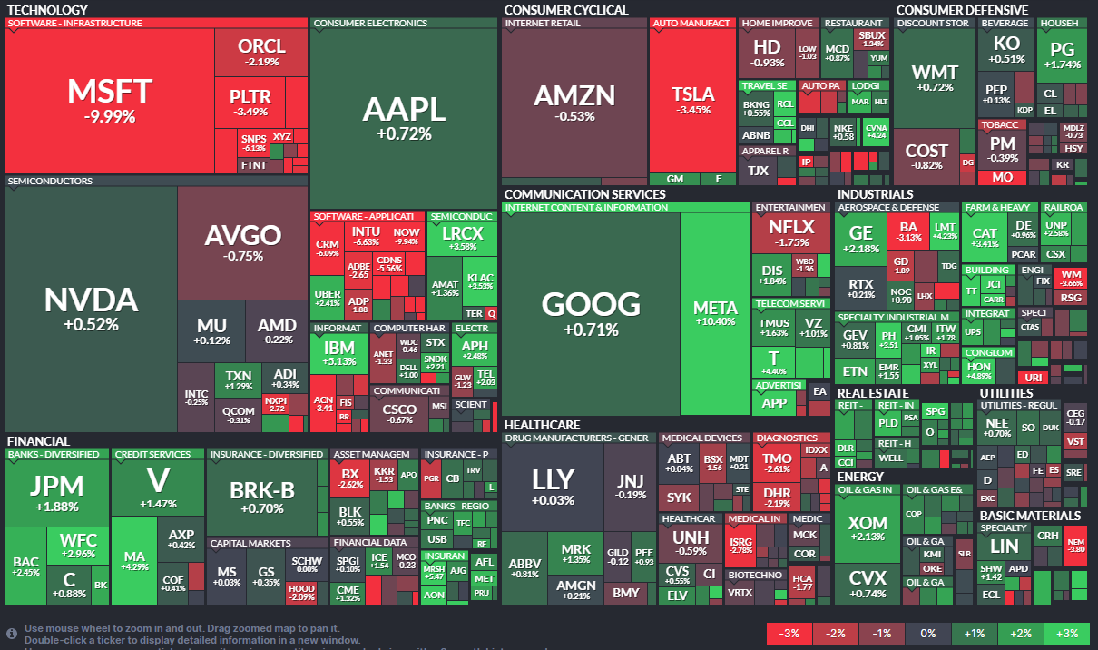Meta Platforms가 강력한 매출·AI 투자 가이던스를 제시하며 +10% 이상 상승, 기술주 손실을 일부 상쇄했습니다.