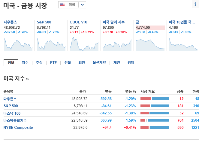 2026.02.05 - [잘먹고 잘살자/금융관련] - 02.04(현지기준) 미국 뉴욕증시 마감 : 기술주 하락으로 S&.P500. 나스닥 하락, 다우지수 상승